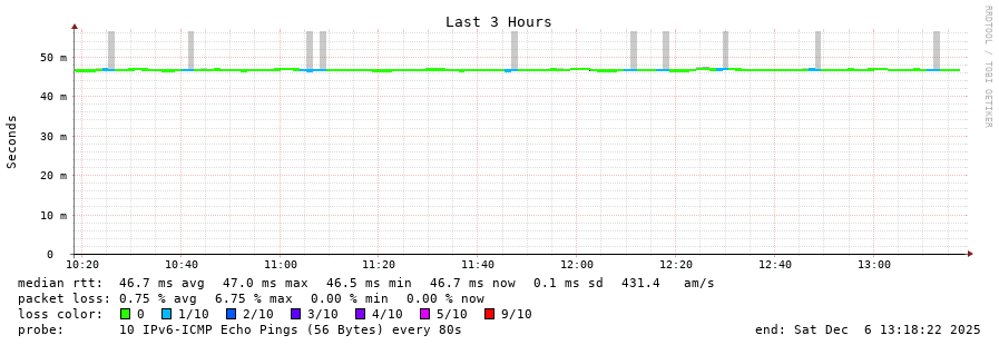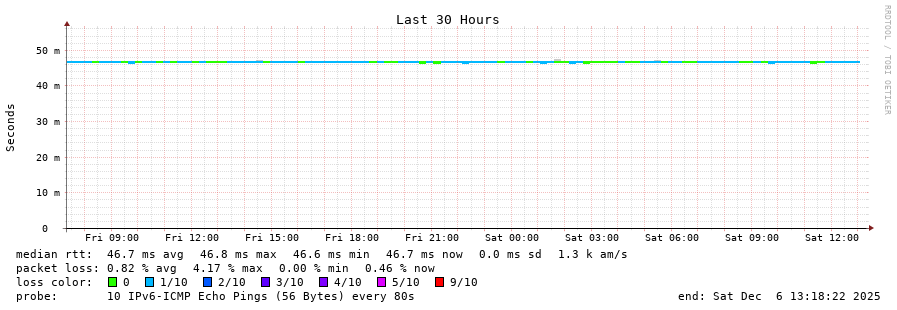 12 > 2001:4350:1:1::ff90 (2001:4350:1:1::ff90) [AS5438] 46.895ms 46.856ms 46.750ms