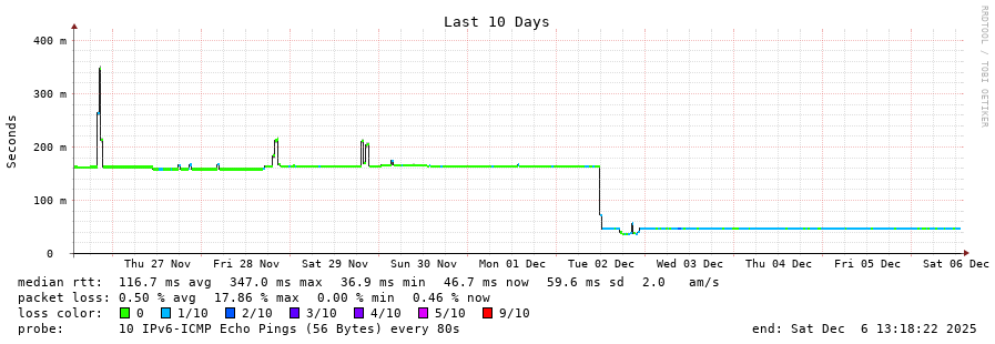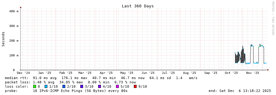 traceroute to 2001:4350:1:1::ff90 (2001:4350:1:1::ff90), 30 hops max, 80 byte packets - Generated at 2025-12-06 13:15:02