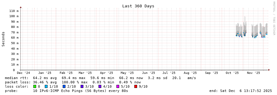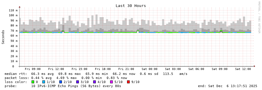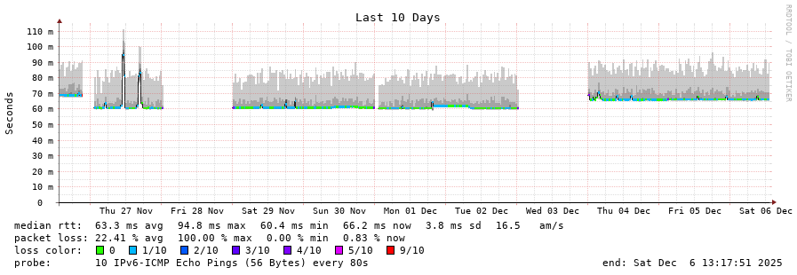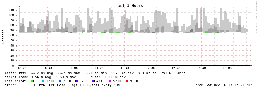 traceroute to 2001:470:1f13:814:1ad6:c7ff:fe2a:502 (2001:470:1f13:814:1ad6:c7ff:fe2a:502), 30 hops max, 80 byte packets - Generated at 2025-12-06 13:15:02