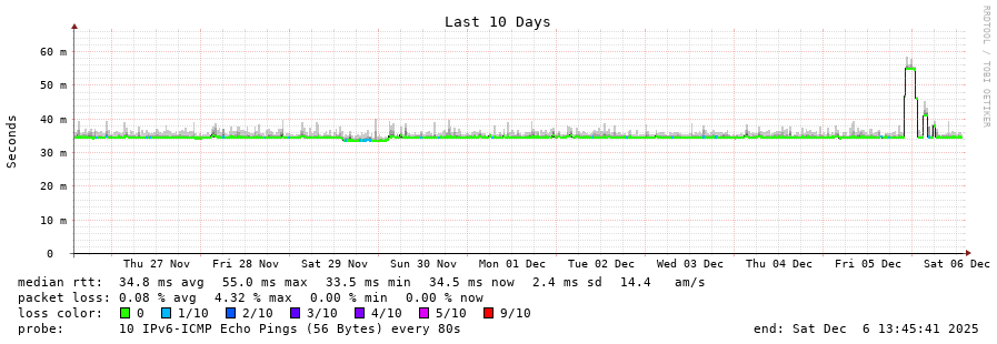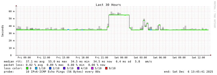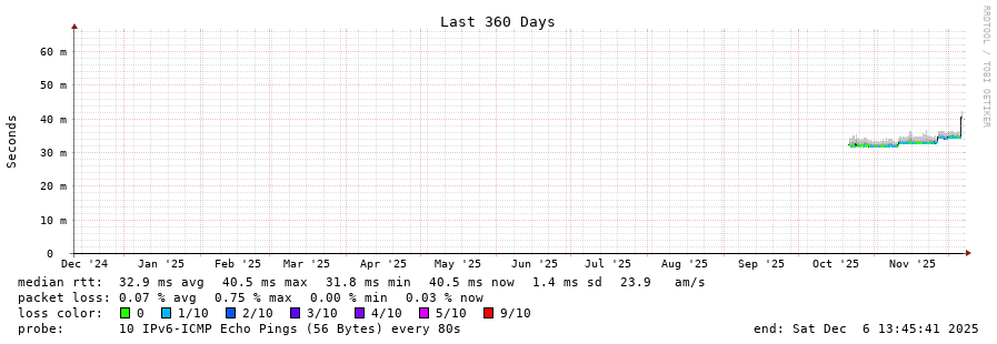 traceroute to 2001:67c:1e0:0:c225:e9ff:fea8:6a0a (2001:67c:1e0:0:c225:e9ff:fea8:6a0a), 30 hops max, 80 byte packets - Generated at 2025-12-06 13:15:02