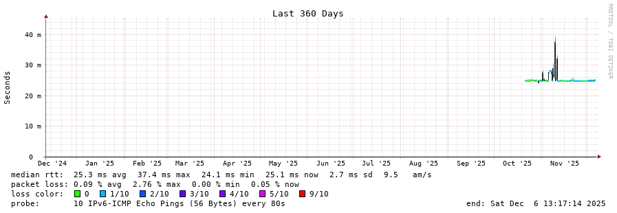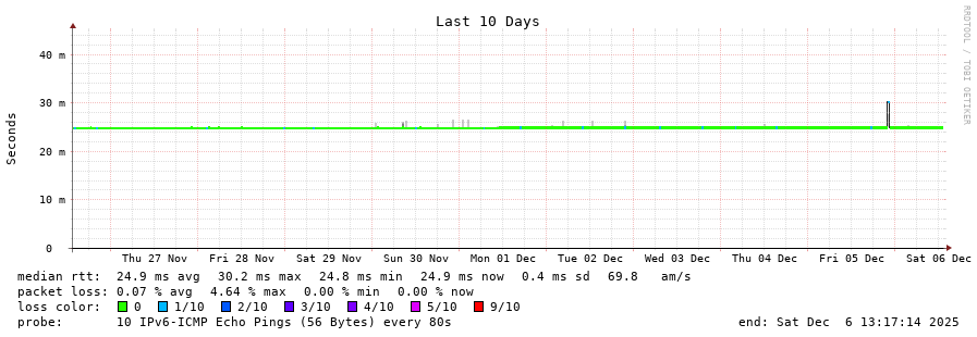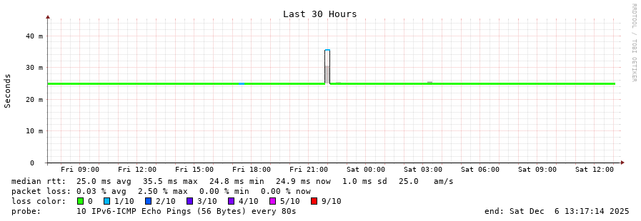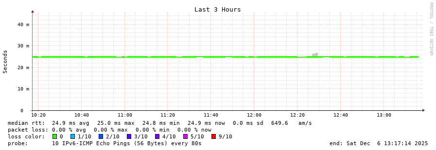 traceroute to 2a00:c30:bbbb:d::2 (2a00:c30:bbbb:d::2), 30 hops max, 80 byte packets - Generated at 2025-12-06 13:00:01