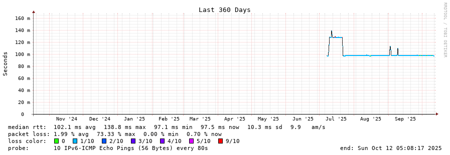 traceroute to 2604:2dc0:307::2:0:377 (2604:2dc0:307::2:0:377), 30 hops max, 80 byte packets - Generated at 2025-10-12 05:00:01