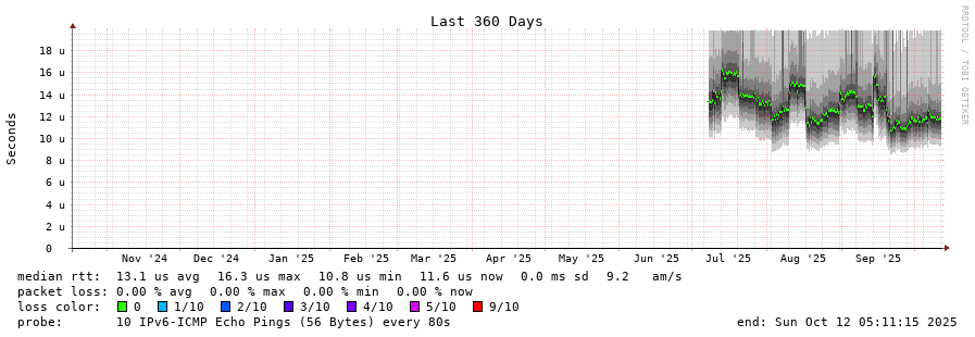traceroute to 2001:41d0:ab05::2:0:261 (2001:41d0:ab05::2:0:261), 30 hops max, 80 byte packets - Generated at 2025-10-12 05:00:01 3 > 2001:41d0:ab05::2:0:261 (2001:41d0:ab05::2:0:261) [AS16276] 0.025ms 0.009ms 0.004ms